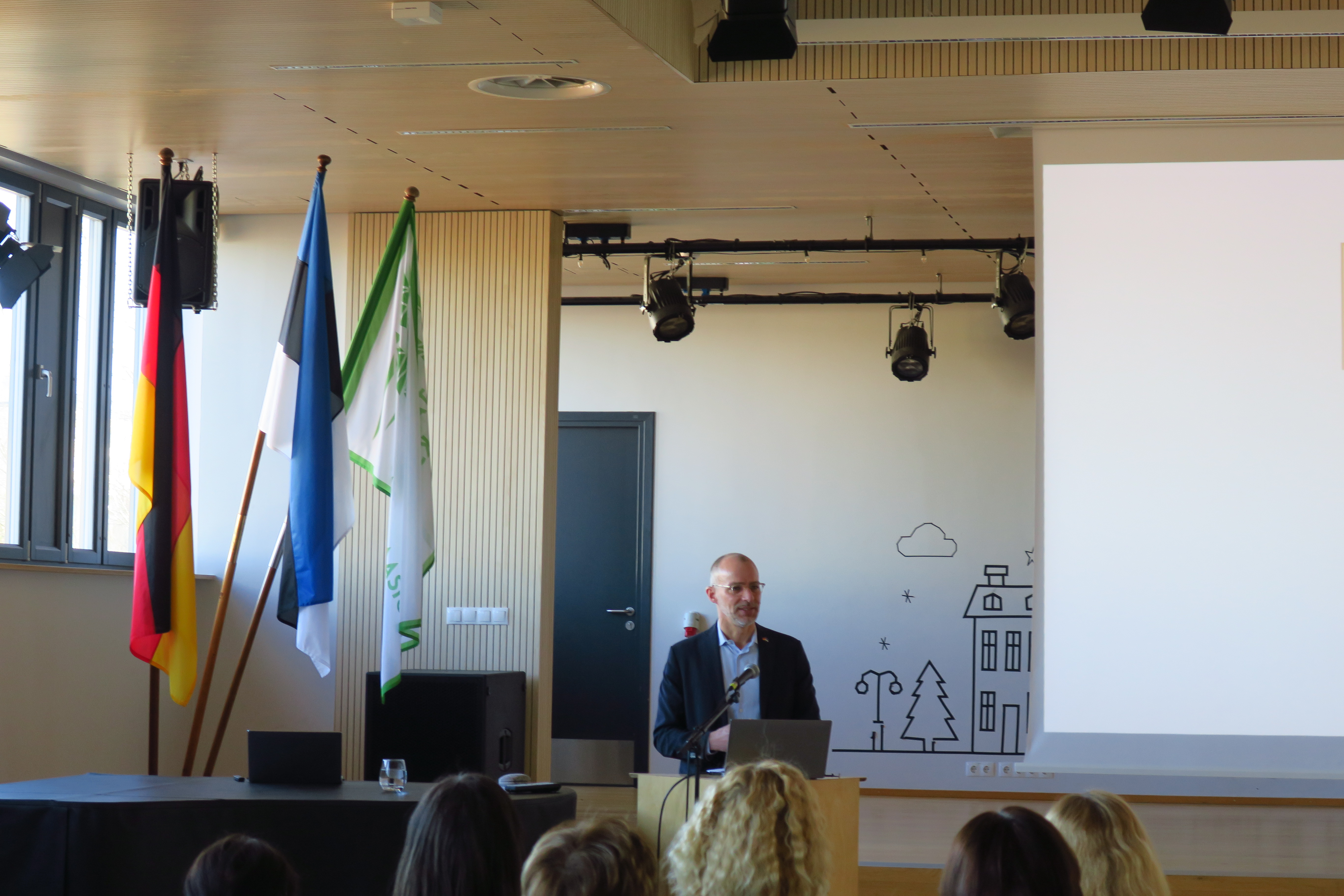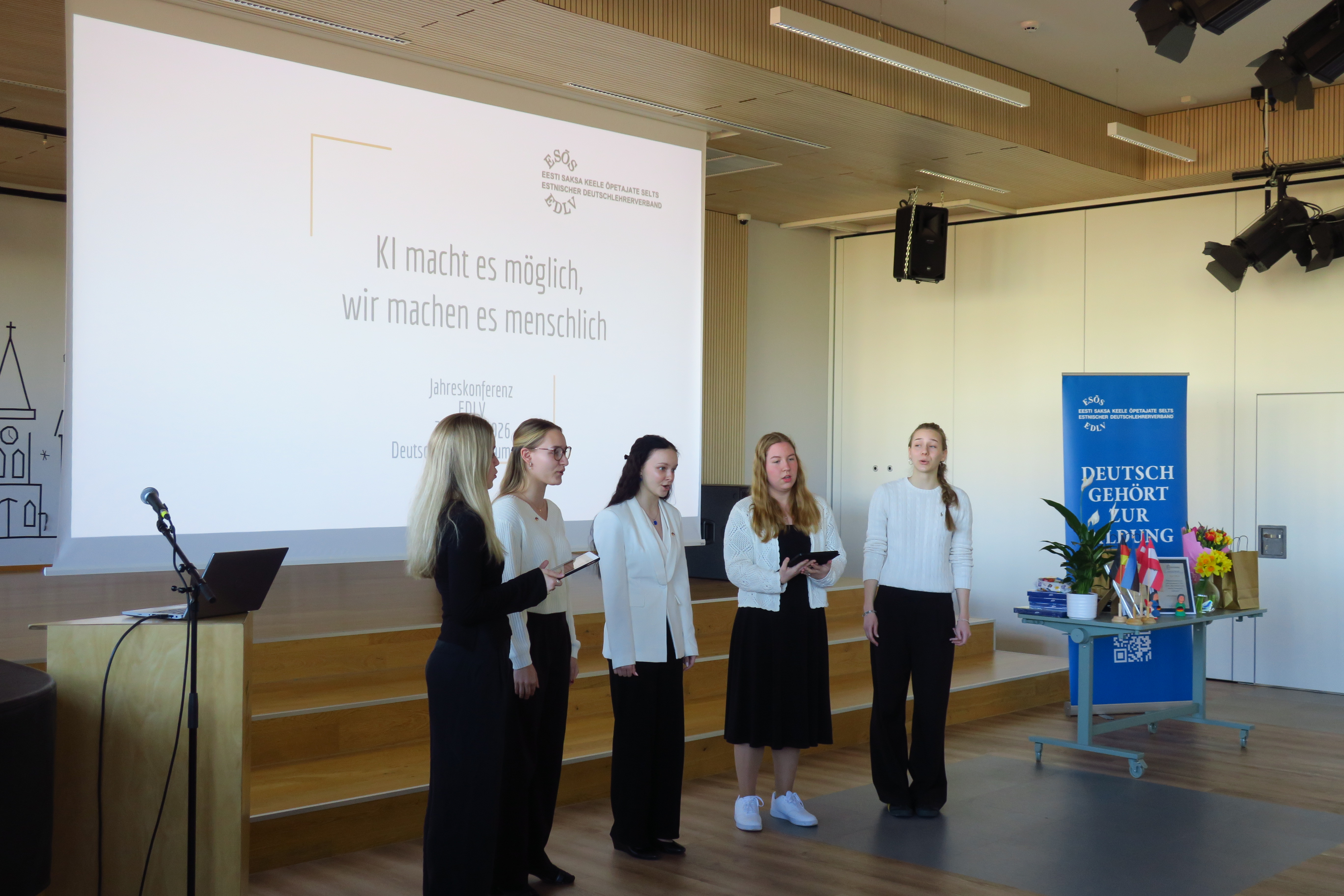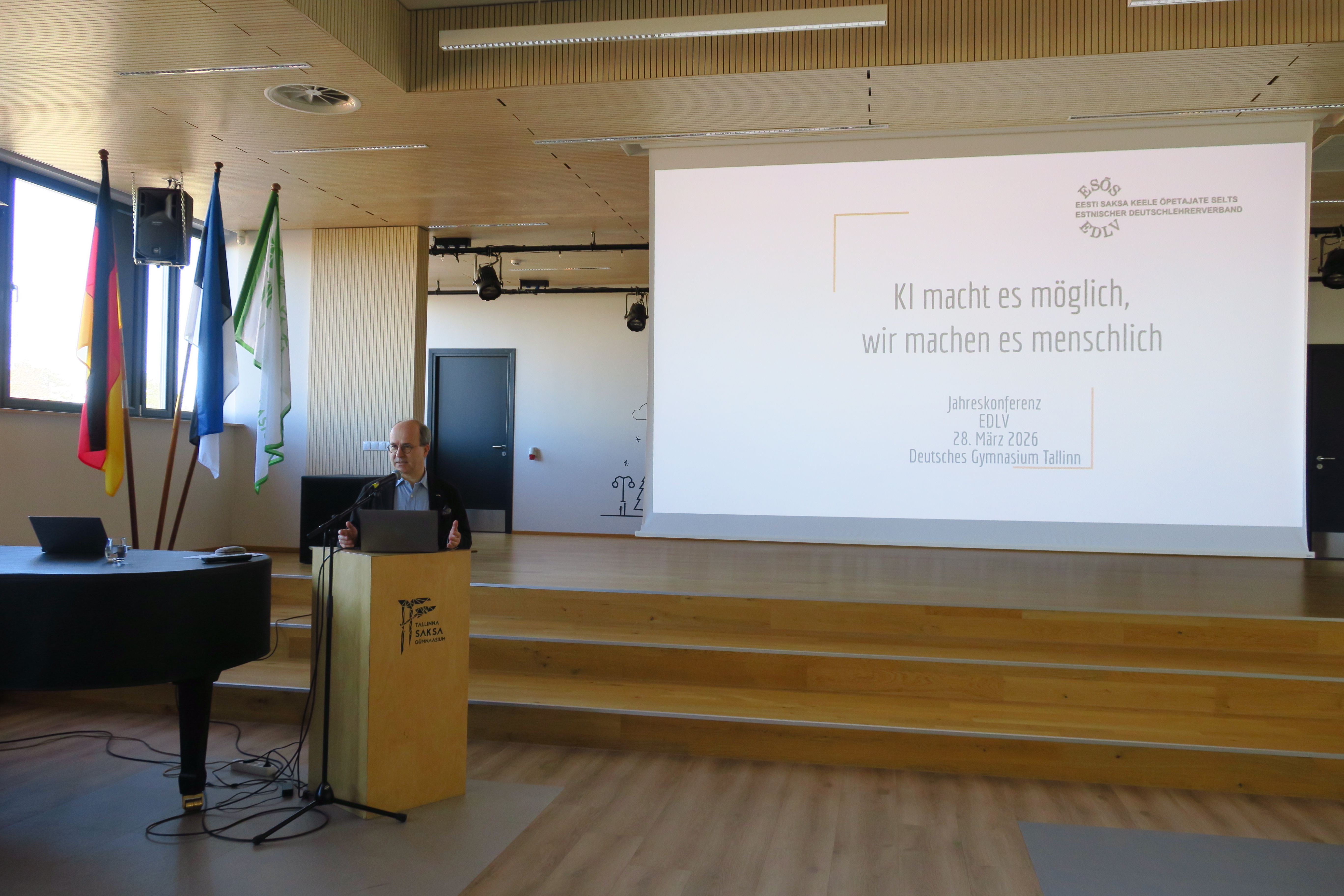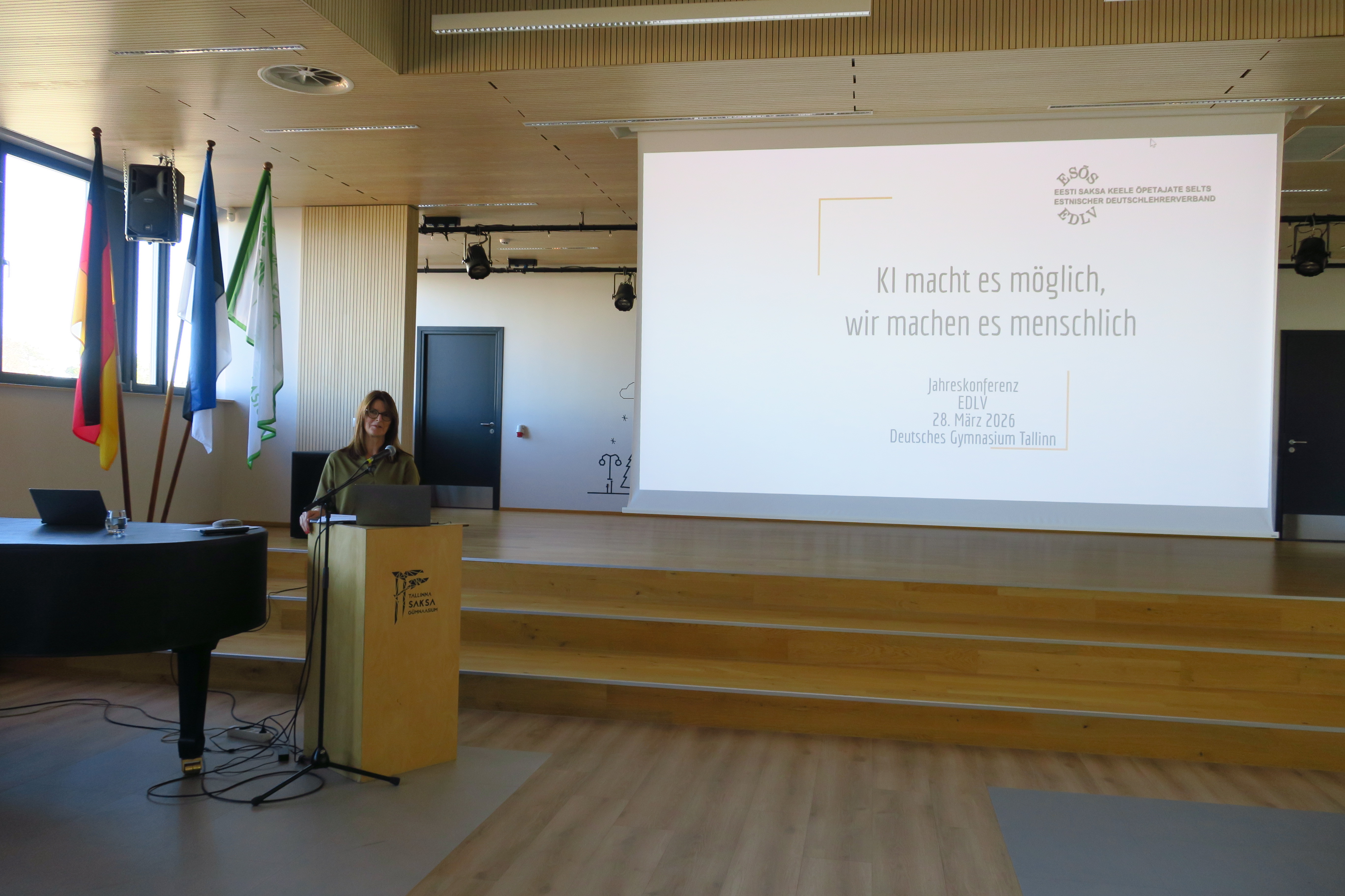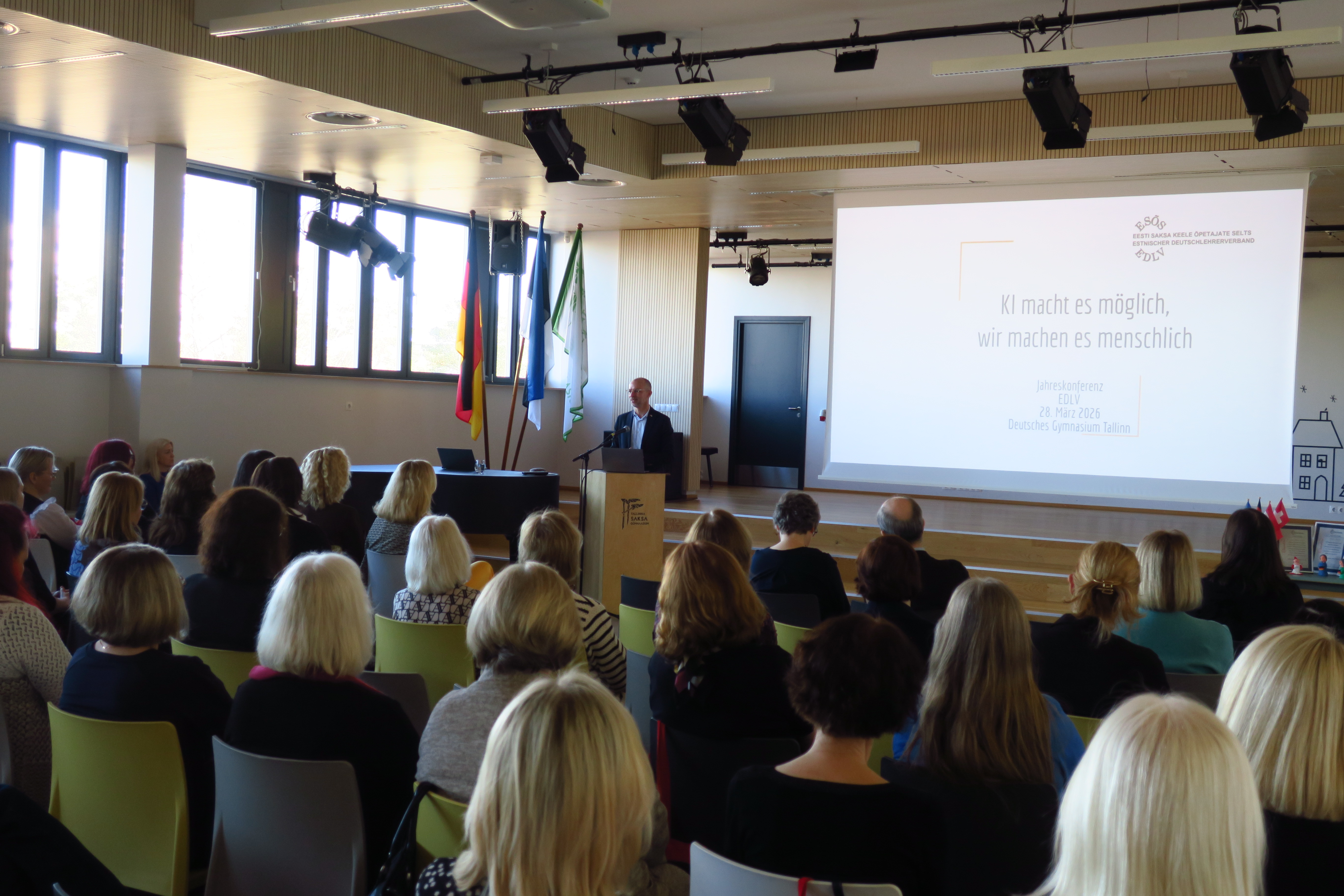 Am 28. März fand die Jahrestagung des EDLV unter dem Motto „KI macht es möglich, wir machen es menschlich“ statt. In Deutschem Gymnasium Tallinn trafen sich Deutschlehrer und Deutschlehrerinnen aus ganz Estland. Die Jahrestagung wurde mit einem musikalischen Auftritt von Schülern des Deutschen Gymnasiums Tallinn eröffnet. Anschließend begrüßten Schulleiterin Maive Merkulova und die Leiterin der deutschsprachigen Abteilung des Deutschen Gymnasiums Tallinn, Claudia Host, die Gäste herzlich. Als Erste ergriff Eve Zekker, die Vorsitzende des Estnischen Deutschlehrerverbandes, das Wort und eröffnete die Konferenz offiziell. Anschließend richteten Jan Scheer (Botschafter der Bundesrepublik Deutschland in Estland), Peter Mikl (Botschafter der Republik Österreich in Estland) und Dorothea Schulz, Fachberaterin für Deutsch als Fremdsprache in Tallinn, Grußworte an die Anwesenden. Im Anschluss folgte der Jahresbericht des EDLV 2025. Die Vorstandsmitglieder Eve Zekker, Diana Kollin-Poom und Juta Laane gaben einen Überblick über die Aktivitäten des Estnischen Deutschlehrerverbandes im Jahr 2025.