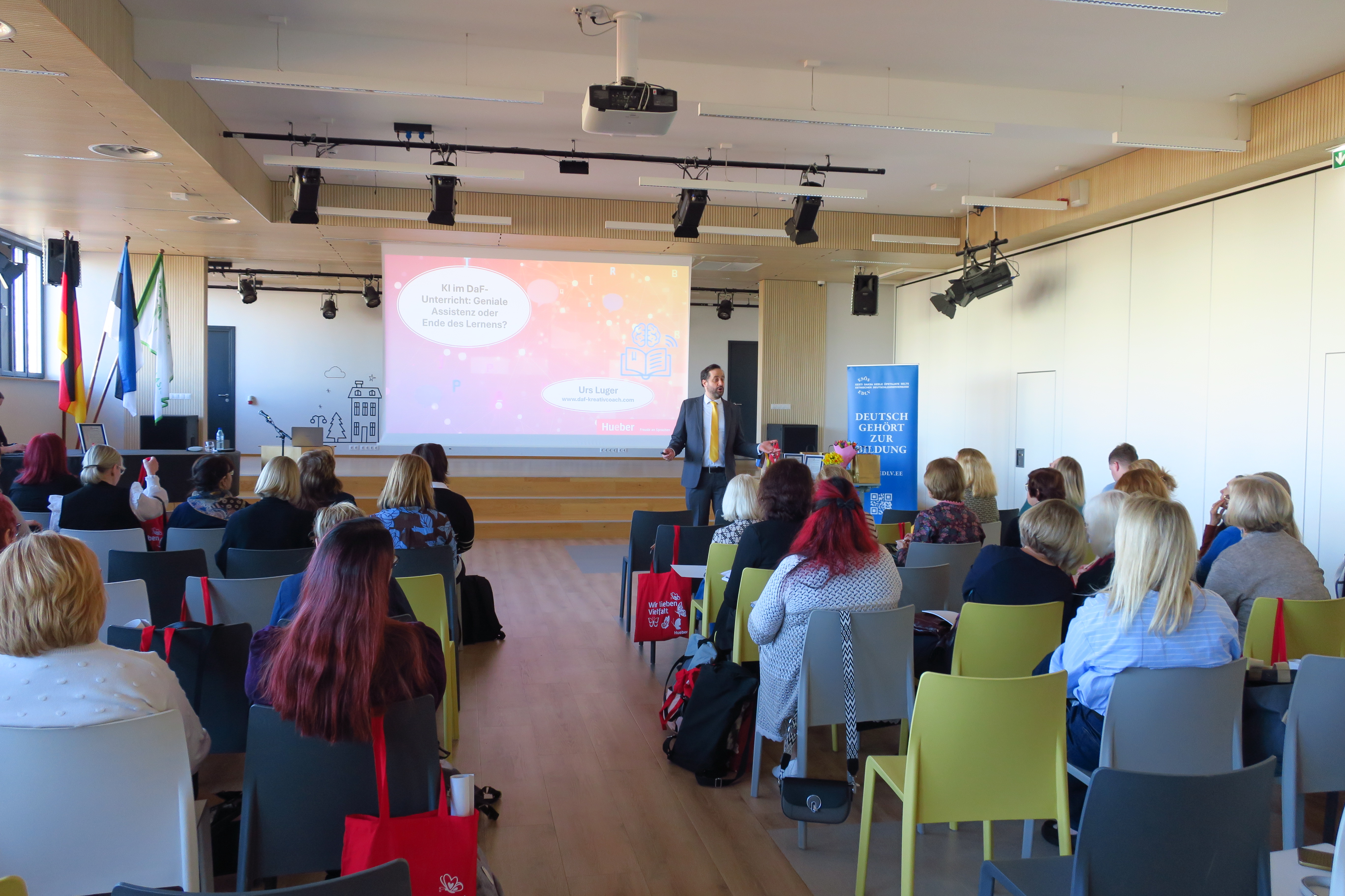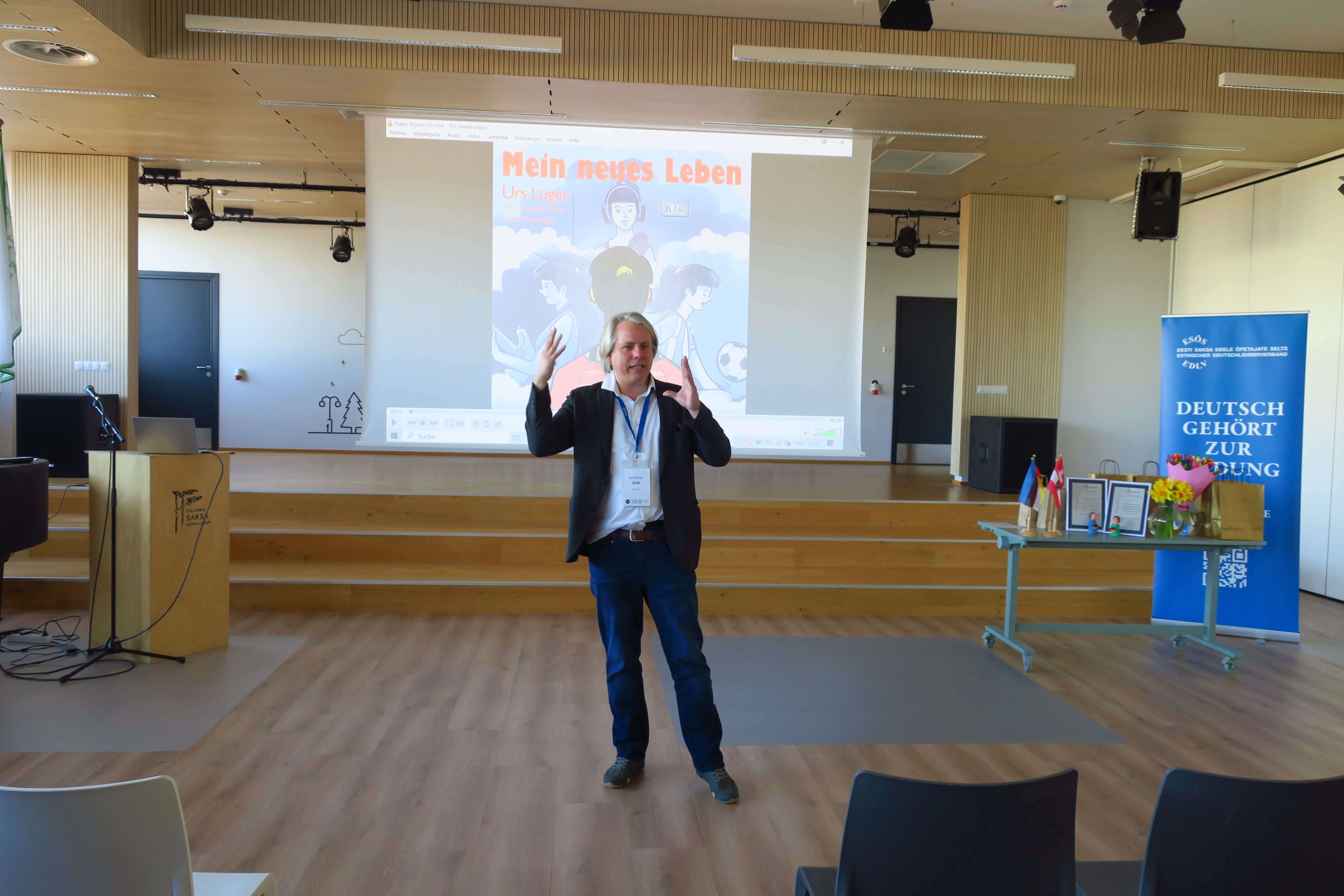 Danach ging es weiter mit dem Plenarvortrag „KI im DaF-Unterricht: Geniale Assistenz oder Ende des Lernens?“ (Urs Luger, Hueber Verlag, Österreich). Der zweite Plenarvortrag trug den Titel „Lehren im Zeitalter der künstlichen Intelligenz“ (Elke Höfler, ECML, Graz). Es folgte die Präsentation des Projekts „Mein neues Leben“ von Urs Luger (Hueber Verlag, Österreich) und Andreas Volk (Gastdozent für Deutsch an der Universität Tallinn und DAAD-Dozent).