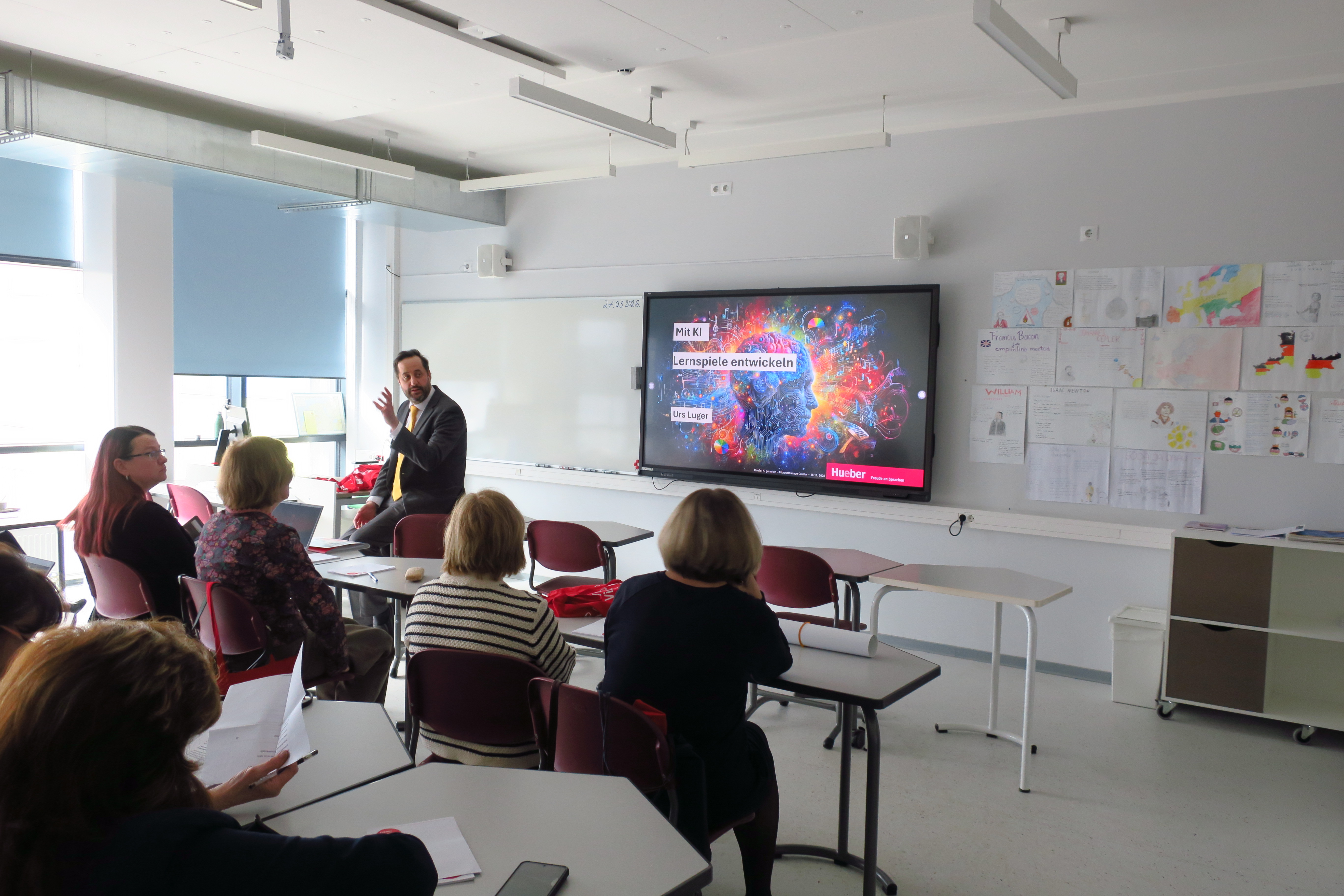 Nach der Mittagspause folgten die Workshops: „Tolle Lernspiele entwickeln? Das kann die KI auch!” (Urs Luger, Hueber Verlag, Österreich); „Mit KI-Werkzeugen